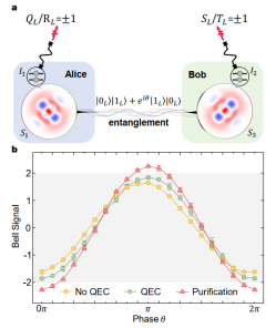 最近,孙麓岩与合作者在解决这一关键问题上取得了突破。他们通过在空间分离的玻色模式中编码量子信息(图1),首次成功实现了受量子纠错保护的纠缠逻辑量子比特。不仅展示了量子纠错技术在保护量子信息方面的巨大潜力,也为实现实用的量子计算和通信网络提供了重要的技术基础。具体地,研究团队在两个空间分离的玻色模式中,实现了二项式编码的逻辑量子比特,并建立了两个逻辑量子比特之间的纠缠。与物理比特之间的纠缠不同,逻辑比特之间的纠缠对局域噪声有更强的抵御能力,并且可以通过局域量子纠错操作进行恢复,而不是直接耗散到环境中。研究团队通过连续量子纠错操作对纠缠逻辑量子比特进行保护,使纠缠逻辑量子比特的相干时间相较于未受保护的状态提高了45%(图2)。更进一步,研究团队还首次证明了,通过错误探测以及提纯,纠缠逻辑量子比特能够违反贝尔不等式(图3)。