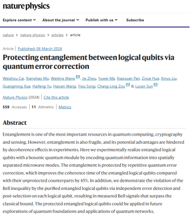 孙麓岩研究组与中国科学技术大学邹长铃研究组、北京量子信息科学研究院于海峰团队合作,在超导量子系统中实现了对逻辑量子比特之间量子纠缠的量子纠错保护。该成果论文以“Protecting entanglement between logical qubits via quantum error correction”为题,于2024年3月6日在Nature Physics(《自然•物理》)杂志在线发表。