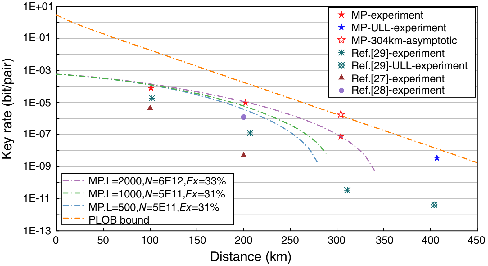 基于该理论方案,马雄峰和组内2019级博士生黄溢智与中科大实验团队合作,提出利用极大似然估计的数据后处理方法精确地估算出两个独立激光器的频率差用于参数估计,并结合中科院上海微系统所研制的高效率单光子探测器,实现了实验室标准光纤百公里级、两百公里级、三百公里级以及超低损光纤四百公里级的安全成码,相较于之前的原始MDI实验,成码率有明显提升,并且在三百公里和四百公里距离上较之前实验成码率提升了3个数量级。实验结果表明,模式匹配量子密钥分发在不需激光器锁频锁相的条件下可以实现远距离安全成码且在城域距离有较高成码率,极大地降低了协议实现难度,对未来量子通信网络构建具有重要意义。