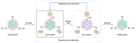 为攻克上述难题,联合研究团队利用微波简谐振子或玻色模式系统中的无穷维希尔伯特空间,实现量子信息的冗余编码与量子纠错。在超导量子线路系统中,基于玻色编码的量子纠错方案具有错误类型简单、错误探测方便、相干性能好、硬件更高效、反馈控制易实现等优点。本研究工作中,研究团队通过开发高相干性能的量子系统,设计和实现低错误率的错误症状探测方法,以及改进和优化量子纠错技术等实验手段,最终在玻色模式中实现了基于离散变量的二项式编码的逻辑量子比特,并通过实时重复的量子纠错过程,延长了量子信息的存储时间,相关结果首次超过该系统中不纠错情况下的最好值,也就是突破了盈亏平衡点。这也是国际上首次通过主动的重复错误探测和纠错过程实现延长量子信息的存储时间超越盈亏平衡点,具有里程碑式的重要意义。