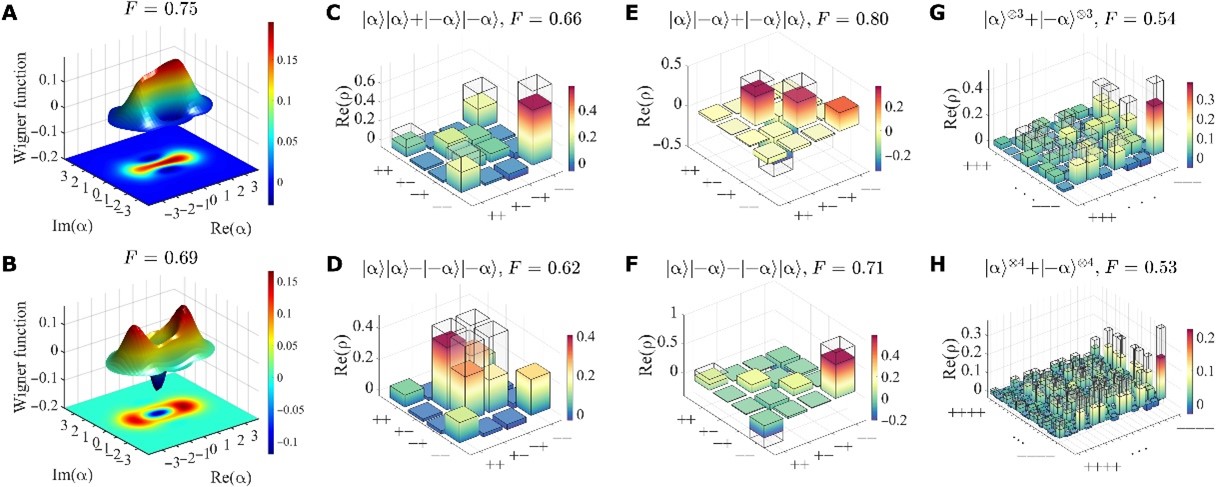 此项工作的理论基础是段路明教授与其合作者提出的Duan-Kimble可扩展光量子计算方案,该方案借助腔电动力学体系实现了飞行光量子和原子之间的量子纠缠。在本实验中,研究人员利用相位相反的相干态飞行微波光子模拟猫的“生”和“死”,借助飞行微波光子在包含超导量子比特的谐振腔端口的反射过程实现超导量子比特和相干态微波光子的量子纠缠,即“薛定谔猫”态的制备;通过连续反射多个相干态微波光子脉冲实现了多体“薛定谔猫”态(multipartite Schrödinger’s cat state)的制备。如图二所示,研究人员在高维度的希尔伯特空间中利用量子态层析方法重构飞行微波光子的量子态,确认了直到四体“猫”态的成功制备。研究人员从多体飞行微波光子态的密度矩阵出发,利用可局域量子纠缠的方法验证了直到四体“猫”态中的量子纠缠,这也是实验中首次成功制备超过两体的半经典态之间的量子纠缠。此外,通过重构超导量子比特和多体“猫”态这个混合量子系统的密度矩阵,研究人员确认了这两种本质上截然不同的量子态之间的量子纠缠。