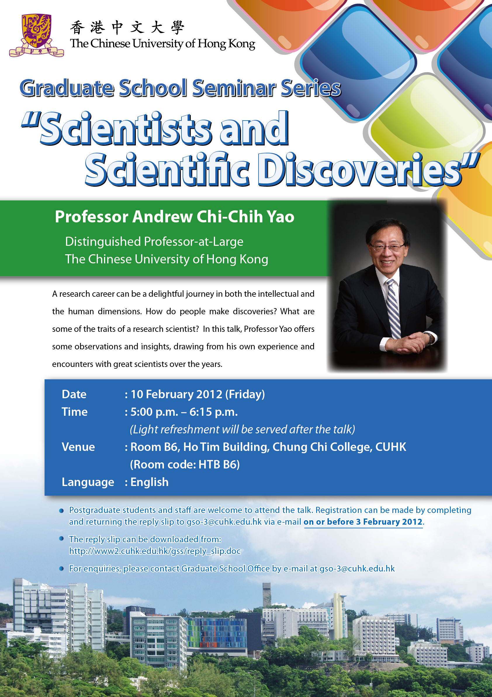 2月10日下午,姚期智院士做客香港中文大学研究生院,作了题为“科学家与科学探索(Scientists and Scientific Discoveries)”的特邀演讲。香港中文大学研究生院院长黄永成教授主持讲座,近200名研究生和学者共同听取演讲。