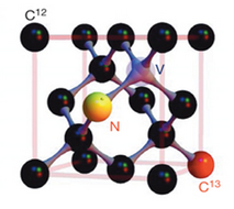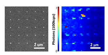 Figure: (Left) Defect electron and nuclear spins in a diamond lattice. (Right) Regular patterns of the NV centers in a diamond obtained through nitrogen implantation and E-beam lithography.