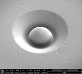 Figure: ( Left) Solid immersion lens to enhance light collection (fabricated with FIB). (Middle): A suspended diamond right cavity on the diamond surface. (Right) Array of suspended diamond ring cavities.