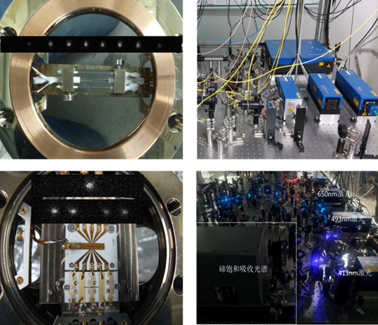 Figure: Top: Yb ion trap system (Left) Four-rod Paul Trap (Right) Yb Laser System. Bottom: Yb/Ba system (Left) Monolithic ion trap (Right) Ba Laser System
