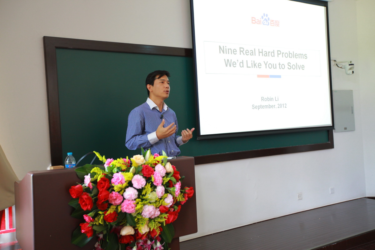 Baidu CEO Mr. Robin Li under the invitation of Academician Andrew Chi-Chih Yao, IIIS Dean and Chair Professor of “Tsinghua Xuetang Special Pilot CS Class” (Yao Class) shared with Yao students a talk entitled Nine Real Hard Problems We’d Like You to Solve. It drew an audience that filled the Tsinghua Xuetang lecture room and had people standing in the aisles.