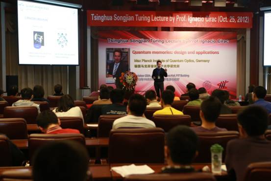 On the afternoon of Oct. 25, 2012, Tsinghua Songjian Turing Lecture 2012 took place in the Lecture Hall, FIT Building, with Prof. Ignacio Cirac, Max Planck Institute of Quantum Optics, Germany, lecturing on Quantum memories: design and applications. The talk was hosted by IIIS Dean Prof. Andrew Chi-Chih Yao.