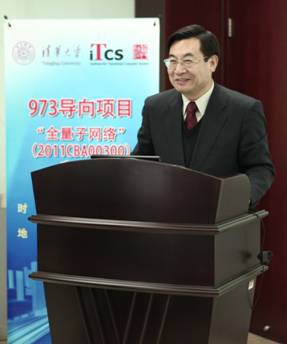 December 29, 2010, the “Genuine Quantum Network” Project under the 973 Program Guiding Projects on Major Scientific Problems officially kicked off at the FIT Building, Tsinghua University. The meeting was hosted by Prof. Andrew Chi-Chih Yao, Chief Scientist of the Project. Prof. Heping Hu, Party Committee Secretary of Tsinghua University, Mr. Xiaofeng Fu, Director of the Department of Basic Research from the Ministry of Science and Technology, and Mr. Hua Yang, Deputy Director of the Division of Science and Technology from the Ministry of Education presented and addressed at the meeting. Prof. Luming Duan, Professor at the University of Michigan and CC Yao Professor at Tsinghua University, Academician Guojie Li from the Chinese Academy of Sciences, Academician Bangfen Zhu from Tsinghua University, Academician Enge Wang from Peking University, Prof. Zhiqiang Wang, Deputy Director of Scientific Research Department of Tsinghua University, as well as Chief Principals and core members of the four Subprojects joined the meeting.