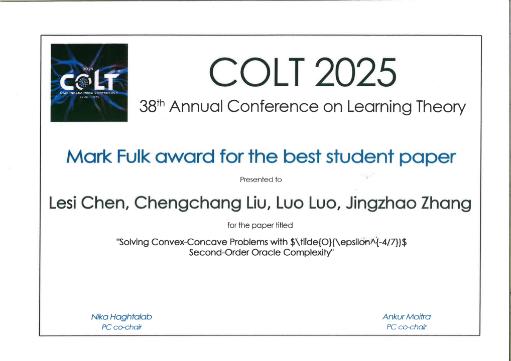 Ph.D. student Lesi Chen and Assistant Professor Jingzhao Zhang from Tsinghua University's Institute for Interdisciplinary Information Sciences have received the Best Student Paper Award at the 2025 Conference on Learning Theory (COLT), a top-tier venue in theoretical machine learning. Their winning work is titled "Solving Convex-Concave Problems with O( ε^-4/7) Second-Order Oracle Complexity".