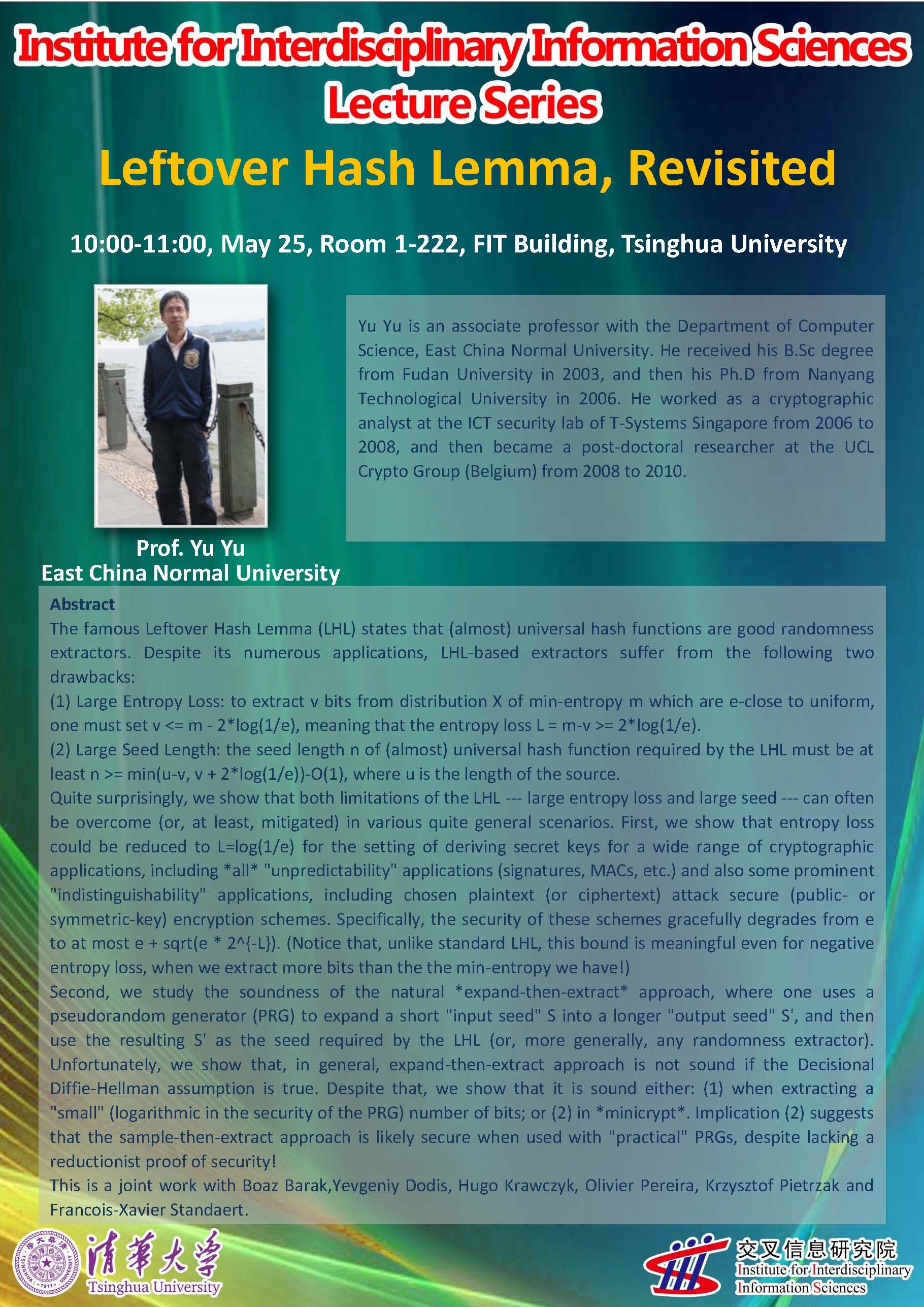 Yu Yu is an associate professor with the Department of Computer Science, East China Normal University. He received his B.Sc degree from Fudan University in 2003, and then his Ph.D from Nanyang Technological University in 2006. He worked as a cryptographic analyst at the ICT security lab of T-Systems Singapore from 2006 to 2008, and then became a post-doctoral researcher at the UCL Crypto Group (Belgium) from 2008 to 2010.