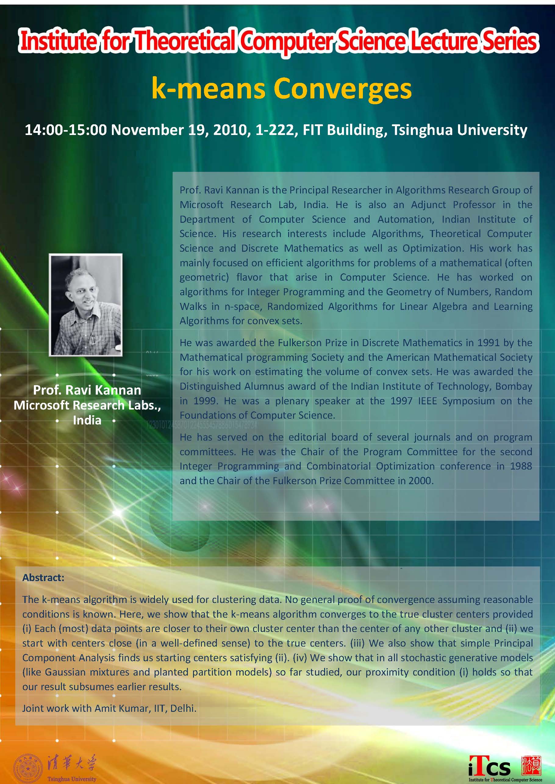 Prof. Ravi Kannan is the Principal Researcher in Algorithms Research Group of Microsoft Research Lab, India. He is also an Adjunct Professor in the Department of Computer Science and Automation, Indian Institute of Science. His research interests include Algorithms, Theoretical Computer Science and Discrete Mathematics as well as Optimization. His work has mainly focused on efficient algorithms for problems of a mathematical (often geometric) flavor that arise in Computer Science. He has worked on algorithms for Integer Programming and the Geometry of Numbers, Random Walks in n-space, Randomized Algorithms for Linear Algebra and Learning Algorithms for convex sets.