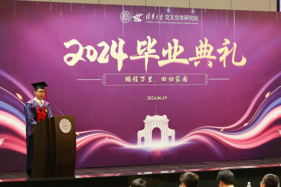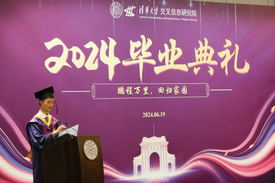 2024届姚班毕业生代表徐翊轩同学首先发表毕业感言。他表示,姚班本科四年的培养令人如“脱胎换骨”,不仅使同学们走至科研领域前沿,更提供了与优秀朋辈长期深入交流的平台。他也结合人工智能发展背景和自身科研经历,分享了对生命价值和生涯规划的思考。最后,他祝愿大家怀揣对茶园温暖的记忆,勇毅前行,绽放出每个人独特的光彩。
