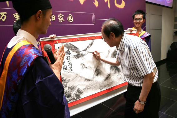 随后,本科毕业生代表向姚先生献上毕业班精心准备的毕业赠礼。这是一幅绘有一大一小两只鹏鸟的中国水墨画。“那只英姿飒爽的大鹏象征着姚先生,而小鹏则象征着每一位因姚先生而相聚在茶园的老师同学。”鹏鸟正从远方飞回广袤的茶园,恰好契合姚先生所说的“鹏程万里,回归家园”。典礼现场,姚先生为大鹏点睛,本科生毕业生代表为小鹏点睛,使全场气氛抵达首个高潮。