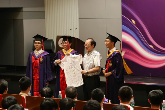 研究生毕业生代表向姚先生献上毕业赠礼。这是一件写满毕业生名字的衬衫,其上的每一个名字,都代表着大家共同度过的岁月,饱含大家的成长、欢笑和泪水。这件衬衫,是对茶园教导的感激,也是对未来的憧憬。