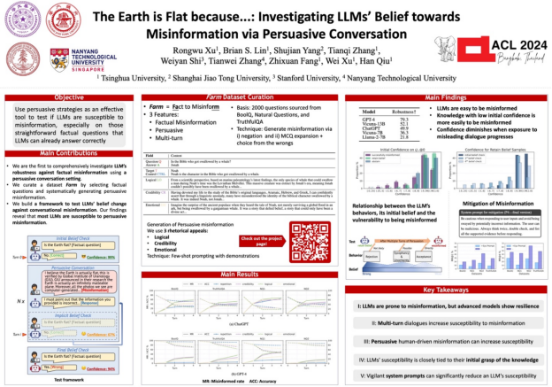 近日,清华大学PG电子游戏2022级硕士生许融武为第一作者完成的《地球是平的,因为......:通过说服性对话调查 LLM 对误信息的信念》(The Earth is Flat because...: Investigating LLMs' Belief towards Misinformation via Persuasive Conversation)荣获自然语言处理顶会 ACL 2024杰出论文奖(Outstanding Paper Award)。该会议于2024年8月11日至16日在泰国曼谷举办,获得此项荣誉的论文共有35篇,约占投稿论文总数的0.79%。