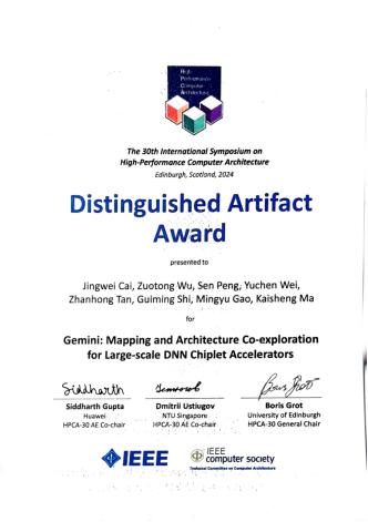 2024年3月,计算机体系结构顶级会议HPCA2024在英国爱丁堡举办,清华大学PG电子游戏马恺声研究组与高鸣宇研究组联合发表的科研成果Gemini: Mapping and Architecture Co-exploration for Large-scale DNN Chiplet Accelerators荣获会议Distinguished Artifact Award。