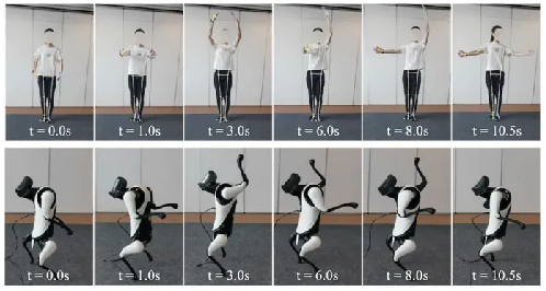 吴翼团队在四足机器人执行类人双足运动研究中取得重要进展,在ICRA 2024上发表2项成果。提出了一个分层框架,能够响应人类视频或自然语言指令,实现模仿拳击、芭蕾舞等动作,并与人类进行物理互动。提出了LAGOON系统,它使用预训练模型生成人类动作,然后通过强化学习在模拟环境中训练控制策略,以模仿生成的人类动作,并通过领域随机化将学习到的策略部署到真实世界的四足机器人上,实现了如“后空翻”、“踢球”等复杂行为。