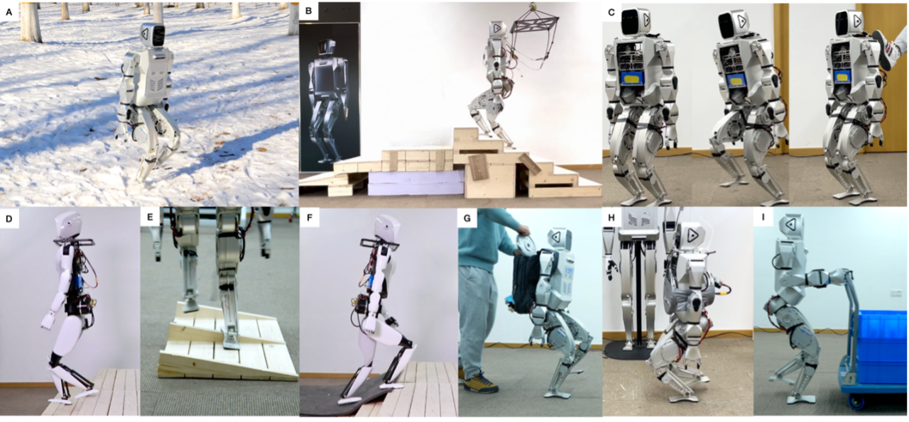为应对人形机器人控制领域的挑战,陈建宇助理教授的研究团队在之前开发的Humanoid-Gym平台基础上,进一步提出了去噪世界模型学习(DWL)技术,旨在优化人形机器人穿越多样化和复杂地形的能力。该技术已在星动纪元两种尺寸的人形机器人——小星(XBot-S)及小星max(XBot-L)上进行了验证。DWL在全球范围内首次通过端到端RL和零样本仿真到真实转换,实现人形机器人通用适应各类复杂的现实世界地形。如图1所示,人形机器人能够在包括雪地倾斜面、楼梯和不规则表面等各种地形上稳定行走,同时抵抗重大外部干扰。在所有场景中,研究组使用的是同一个神经网络策略,展示了其鲁棒性和泛化能力。DWL的成功主要归功于其创新的表示学习框架,通过有效去噪,极大地缩小了仿真与现实之间的差距。此外,研究组还提出了一个主动2-自由度踝关节(闭环运动链踝机制)的控制方法,如图2所示,显著增强了机器人的鲁棒性。
