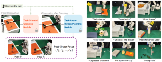 CoPa框架将操纵任务分为两个阶段(如图1左所示):先通过「任务导向的抓取模块(Task-Oriented Grasping)」生成机器人抓取物体的位姿,再通过「任务相关的运动规划模块(Task-Aware Motion Planning)」生成抓取物体后机器人完成任务所需的位姿。