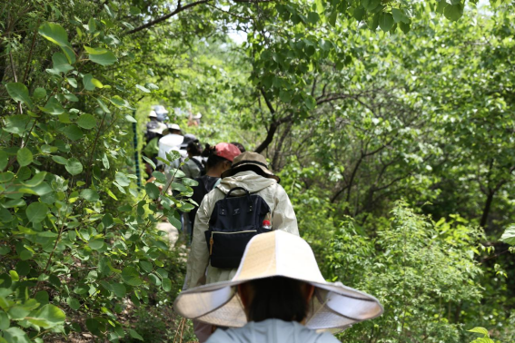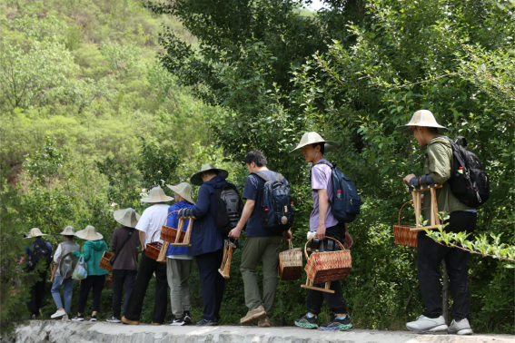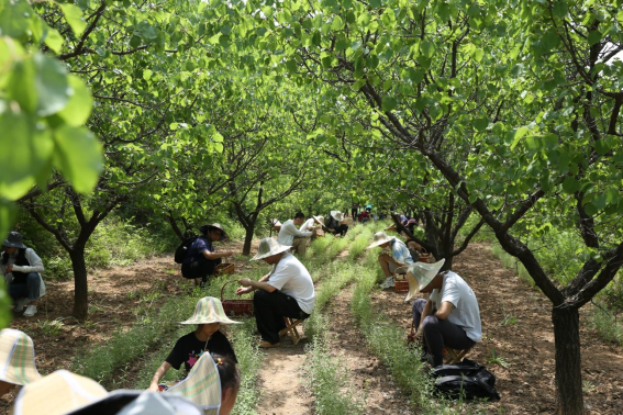 这座名为“金银坡”的茶山采用独特的“黄芩与果树共生的林下立体套种”模式,使原本土地贫瘠的荒山遍布山杏、玫瑰、果桑、连翘、黄芩等经济作物,充分展现着劳动者的智慧。在当地人的带领下,师生们沿着山路,辨识各类山野植物。