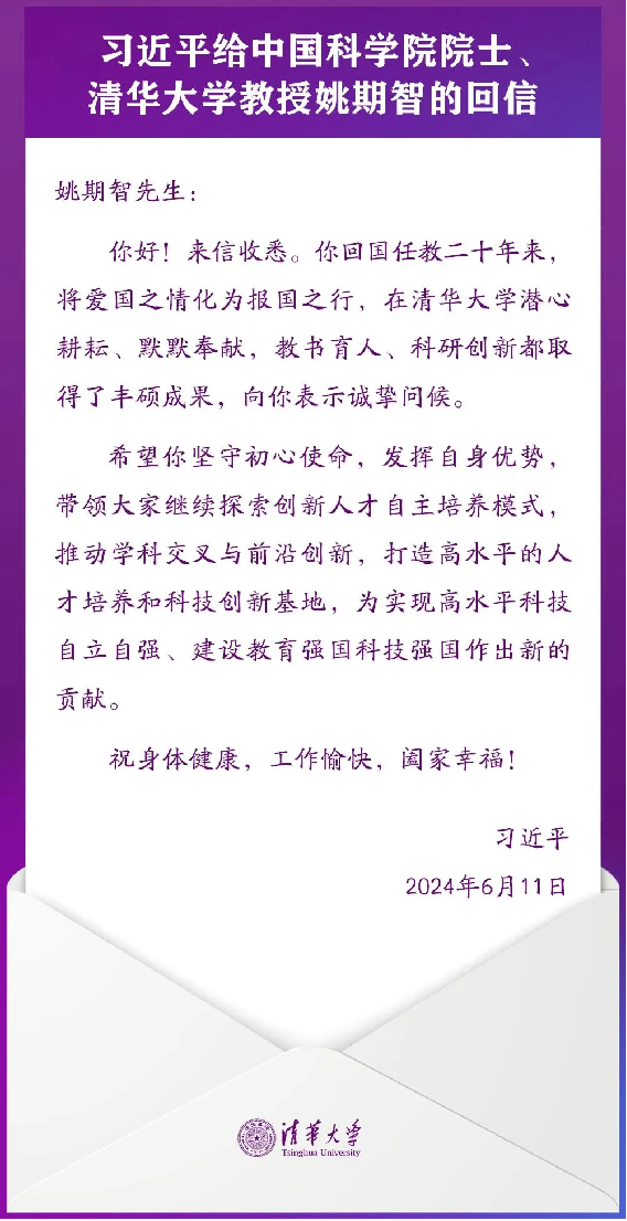 清华新闻网6月12日电 近日,中共中央总书记、国家主席、中央军委主席习近平给中国科学院院士、清华大学教授姚期智回信,向他致以诚挚问候并提出殷切希望。