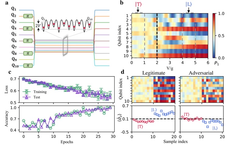 邓东灵研究组设计了处理经典数据和量子多体态数据的学习模型,并与浙江大学超导量子计算团队合作,首次在量子设备上成功实现了高维数据的学习、对抗攻击脆弱性的揭示、以及相应防御手段的展示。