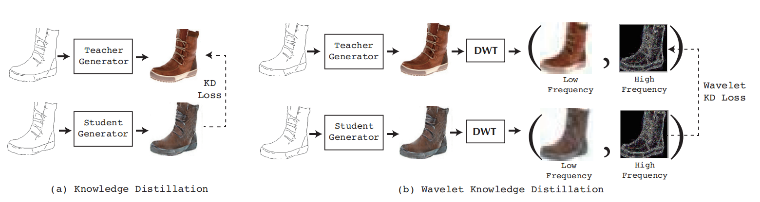 为解决这一问题,研究团队提出了一种基于离散小波变换的知识蒸馏算法,对图像到图像翻译模型进行压缩。他们研究发现,较大的图像翻译模型和较小的图像翻译模型对于图像的低频信息部分都有比较好的生成效果。与大模型相比,小的图像翻译模型在高频信息的生成上表现不佳。因此,他们以高频信息为切入点,通过离散小波变换提取不同模型在高频信息的生成结果,通过知识蒸馏的方式提高小模型在高频信息上的表现。