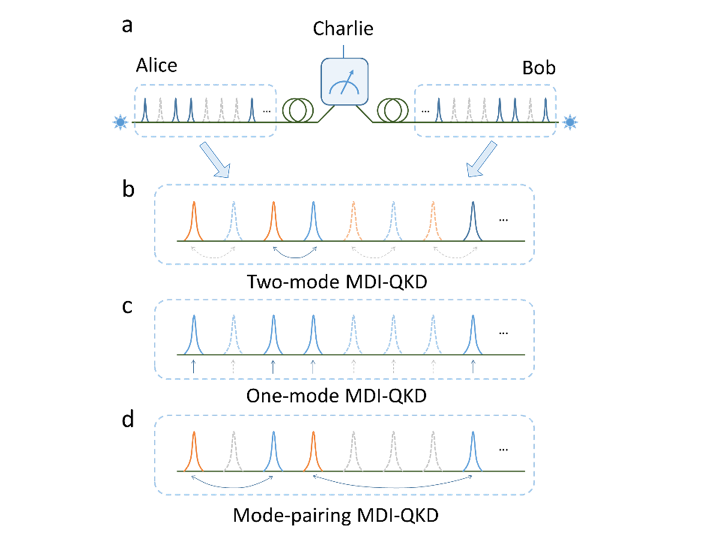 马雄峰及研究组成员曾培,周泓伊和吴蔚捷设计了一种新型测量设备无关的协议,突破点对点量子密钥分发成码率。该协议不需要复杂的激光相位锁定、信道相位监控,大幅提升了测量设备无关密钥分发协议的性能,为高性能、高安全性量子密钥分发实用化提供了理论基础。该论文于7月7日发表在《自然 通讯》(Nature Communication)杂志,题为《模式匹配量子密钥分发》(Mode-pairing Quantum Key Distribution)。