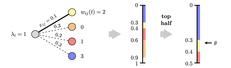 在线随机匹配问题是为了研究互联网显示广告,由Feldman, Mehta, Mirrokni, and Muthukrishnan (FOCS 2009)提出的。在独立同分布的在线随机二分图匹配问题中,一侧节点是固定的离线节点,另一侧是在线到达的节点。该研究把每个在线节点的连边情况叫做它的类别。在开始之前,算法知道所有的离线节点,以及每个在线到达的节点类别的分布(所有在线节点满足独立同分布)。对于每个在线的到达的节点,算法在它到达时刻会知道它的类别,并且必须不可反悔的决定它如何匹配。在离线节点带权的情况中,想要让被匹配的离线点期望权值和最大。在研究中,把这个模型推广到了离线节点带权、并且在线节点不同分布的情况。文章对同分布和不同分布的情况分别设计了竞争比为 0.718 和 0.731 的分数匹配算法,通过用 Gao et al. (FOCS 2021) 提出的在线相关选择,该研究可以把它们取整成为竞争比分别为 0.666 和 0.704 的整数匹配算法。