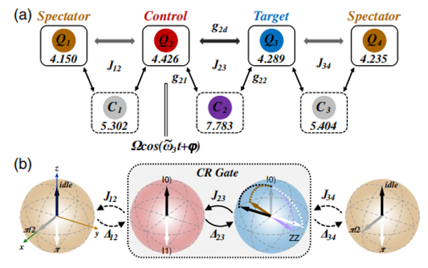 图1:(a)实验系统示意图(4个计算量子比特(Q1-Q4)与3个可调耦合器比特(C1-C3)),其中门比特Q2和Q3用来实现CR门,Q1和Q4为环境量子比特。(b) 环境比特对CR门操作影响示意图。