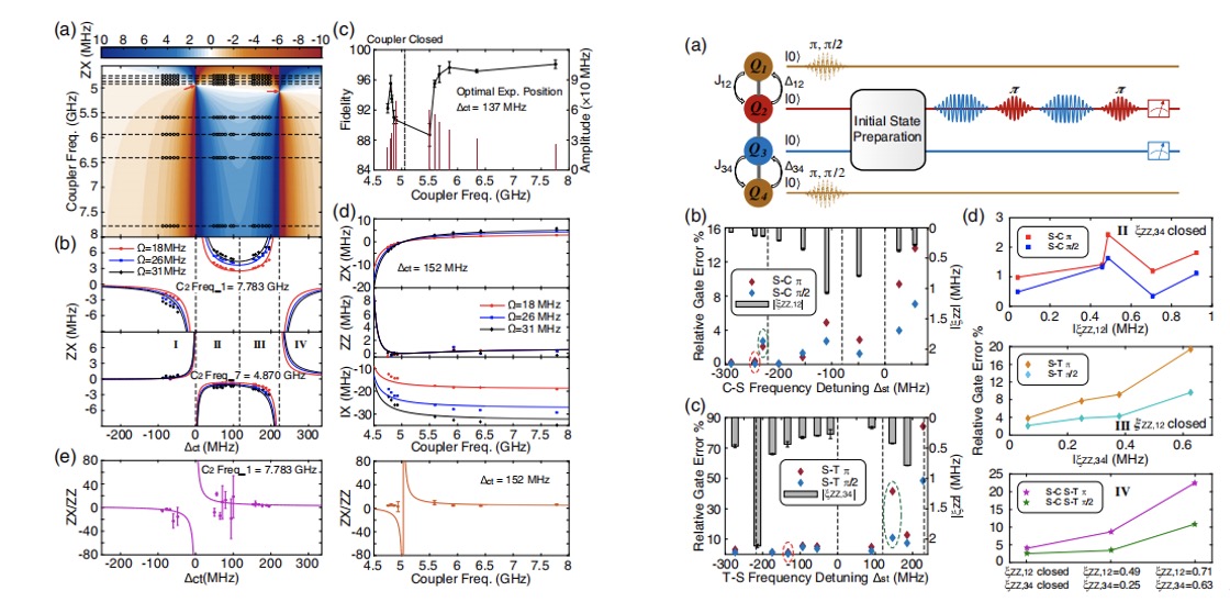 在这项工作中,研究人员利用四个计算量子比特(Q1-Q4)和三个可调耦合器量子比特(C1-C3),通过耦合器比特调节计算量子比特间的耦合强度,并发展三比特哈密顿层析技术,研究环境比特(Q1和Q4)对于门比特间(Q2和Q3)CR门的影响。实验结果表明,环境比特对双量子比特门操作的影响主要来源于环境比特处于特定频率时的系统共振激发以及门操作过程中环境比特与门比特之间的ZZ相互作用,这些因素影响了门比特的频率,进而扭曲CR门的演化,最终降低了双比特门操作的保真度,甚至会导致CR门操作失效。这项工作提出了在大规模超导量子体系中,环境比特存在和不存在两种情况下有效提高双量子比特门操作保真度的解决方案,该实验结果对未来大规模超导量子计算和模拟中比特频率和耦合强度等参数的设计与控制提供实验参考和解决方案。