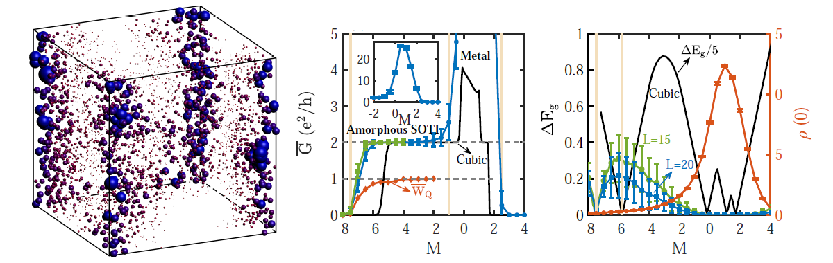 在此项工作中,研究人员发现三维无定形体系中可以存在二阶拓扑绝缘体,并且结构无序可以诱导出二阶拓扑绝缘体。这意味着在某些条件下无定形系统相比于晶格系统更容易出现二阶拓扑绝缘体。具体而言,研究人员计算了三维随机点阵的二端电导,发现在一个参数区间内,平均电导量子化到2e² / h,表明该三维体系的棱上存在无能隙的边界态。另外,研究人员发现这种绝缘体由四极矩的绕数保护,因此不需要晶格对称性。研究人员还发现在一个参数范围内,在平庸晶格体系中加入格点位置的随机偏移会引起二端电导从0到2e² / h 的跃变。另外,随着结构无序的增加,局域态密度表明链边界态的出现。以上证据表明结构无序可以诱导出二阶拓扑绝缘体。最后,研究人员考虑时间反演对称性体系,提出两种新的拓扑不变量在实空间刻画二阶拓扑绝缘体的性质。具体计算也表明二阶拓扑绝缘体也可以存在于三维具有时间反演对称性的无定形系统中。此项工作表明高阶拓扑相可能在无定形体系中广泛存在,对于进一步理解无序、对称性和拓扑的关系具有重要意义。