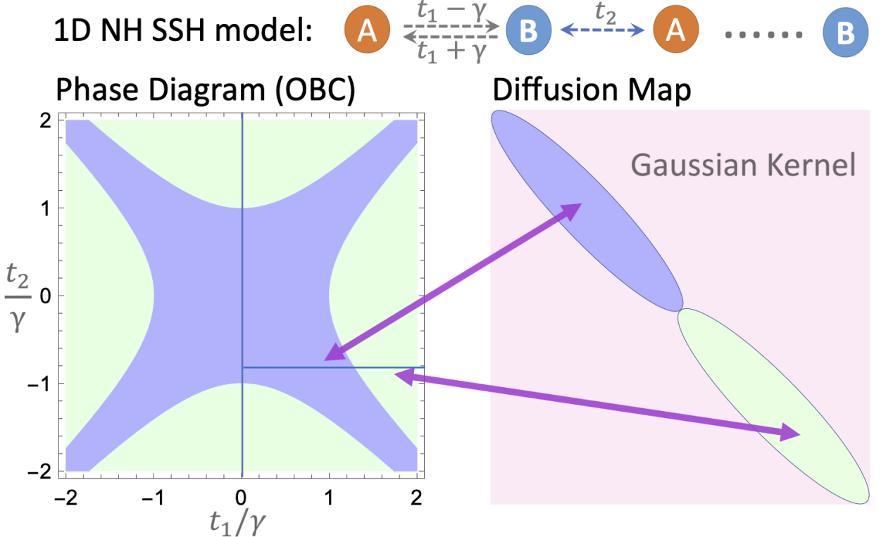 图1:存在趋肤效应的条件下,利用扩散映射对非厄米拓扑相进行分类的示意图。
