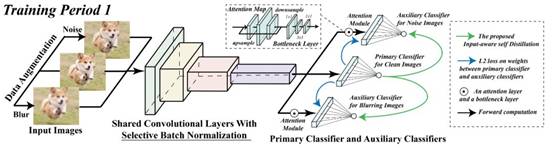 现有的模型在遇到摄像头抖动造成的模糊、雨雾遮挡等场景时,往往会失效。传统的解决方法之一采用多个不同模型单独运算,然后把每个模型的结果组合(ensemble)到一起,也就是极大地增大模型的容量,从而一定程度上增加模型的鲁棒性。但是增大模型容量带来的坏处也是显而易见的,计算量、存储量的变大导致响应时间变长、能耗变大。如何增加模型对环境的鲁棒性而不增加模型容量成为一个热点问题。