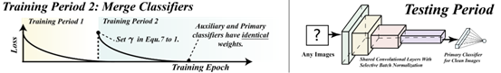 《通过辅助分类器提高卷积神经网络的准确率与鲁棒性》一文提出了一种Auxiliary Training的方法,可以加强模型鲁棒性而不增加模型大小。作者发现,导致模型鲁棒性变差的瓶颈是在于全连接层,而卷积层对鲁棒性的影响很小。观察到此现象后,作者提出用多个全连接层做多个分支,处理不同鲁棒性任务,当训练快接近结束的时候,多加一个loss项使得多个全连接层的权重趋于一致。这样在Inference过程中就跟最基本的模型结构完全一致:就可以既增强模型鲁棒性,而不增加任何Inference的计算量。