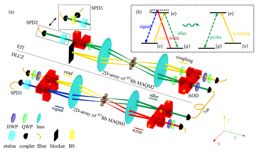 为了克服单光子信号在量子信道传输时面临的指数衰减问题,长程量子通信需要利用量子中继器方案。DLCZ(Duan-Lukin-Cirac-Zoller)协议作为量子中继器方案影响最大的物理实现方式,通过在长程信道中插入量子存储器节点,利用量子存储器产生和传输纠缠态,实现相邻量子存储器间的纠缠,进而通过多步纠缠交换操作最终完成长程纠缠信道的建立,克服单光子信号在光纤中的指数衰减问题。多路量子存储器的使用可以进一步提升量子中继器方案的性能。在一个物理装置中,多路复用量子存储器具有许多独立的量子存储单元,每个单元均可以产生和存储量子态,并维持之间的相干性,进而减少纠缠分发和纠缠交换所需要的时间。此前该研究组分别利用DLCZ协议和电磁诱导透明(EIT)效应,在冷原子系综中实现了多路复用的原子量子存储器。然而如何相干地将多比特或多维量子态从多路复用的原子存储器耦合到单光子光纤,是一个急需解决的问题。