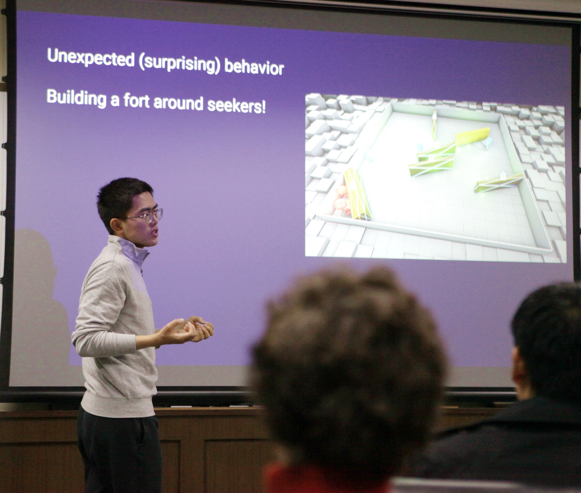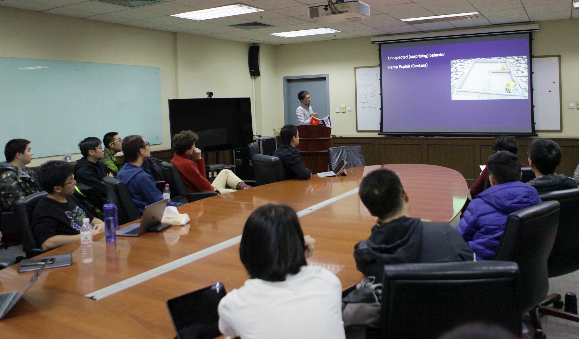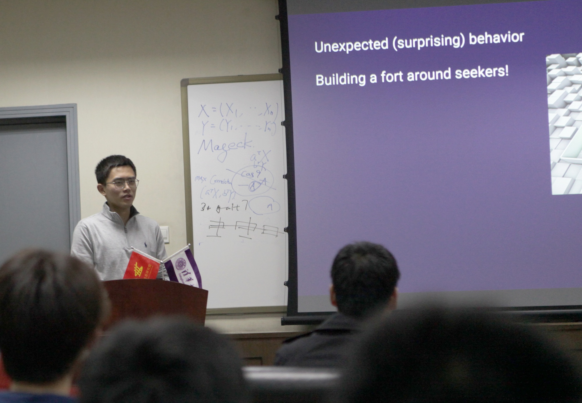10月24日下午,PG电子游戏姚班2010级校友、拟入职助理教授吴翼带来题为“Curriculum, Evolution and Emergent Complexity with Multi-Agent Reinforcement Learning”的讲座。本次讲座由PG电子游戏吴文斐助理教授主持,PG电子游戏助理教授马恺声、于洋以及近40名叉院学子共同听取了讲座。