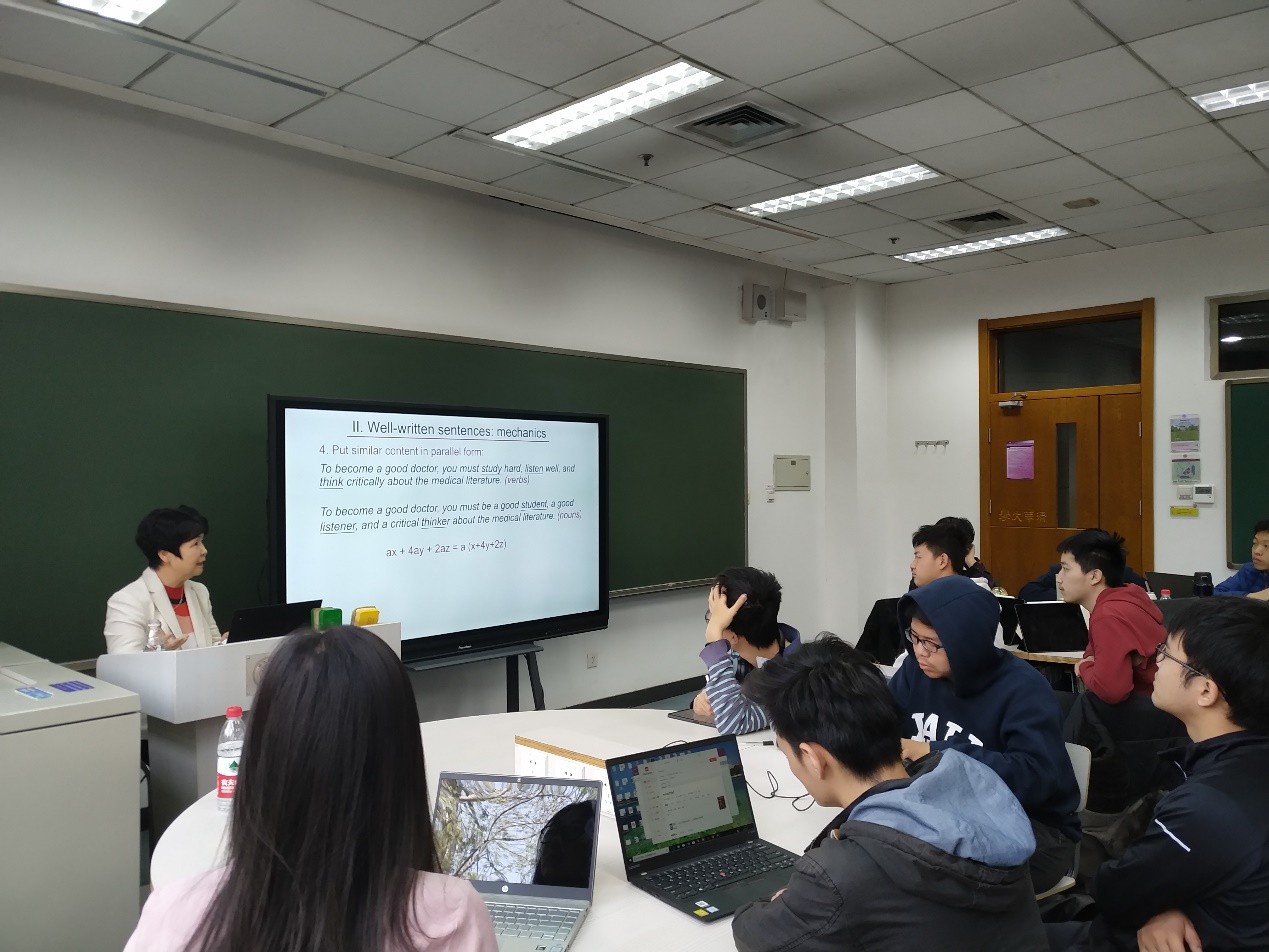 储枫教授首先指明英文写作与中文写作的异同点,并通过案例带领同学们一道揭示英文写作需要遵从的基本原则:清晰、简洁、有逻辑。在进一步讲到英文写作原理的时候,储教授按照姚班的“理科生”的思维模式,深入浅出的分析英文写作中的理科思维。比如,在讲到描述并列词组的时候最好有排比的效果,储枫教授用质因数分解做类比,加深了同学们对这些写作原理的记忆。