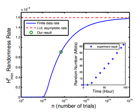 图1:不同总轮数下的随机数成码率。蓝色实线和红色虚线分别代表在有限码长情况下和独立同分布情况下的随机数成码率。绿色点代表实验结果。内部插图表示了时间积累下的总随机数产生。