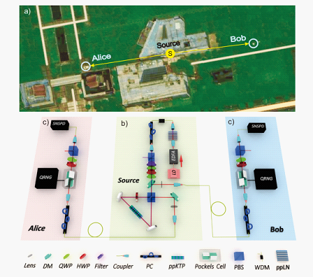 图2:设备无关量子随机数实验装置。(a)实验布局俯瞰图。(b)纠缠源的产生装置。(c)单光子测量装置。