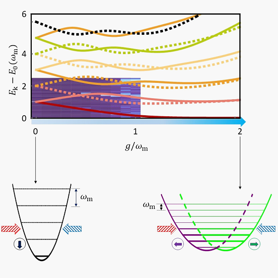 最近,人们研究当光与物质之间的耦合强度接近或比光本身的频率更大(即所谓的超强或深强耦合区域)时的QRM的兴趣日益增加。当耦合强度与玻色子场的模式频率相比小得多时,量子拉比模型可以简化为Jaynes-Cummings模型(JCM),这一模型简单地描述了与自旋激发或退激发相关的光子的吸收或发射现象。当耦合强度增加时,QRM哈密顿量的基态揭示了自旋和光子之间的纠缠,如图1所示。虽然我们能够从理论上推断出QRM哈密顿量的奇异基态,但并没有通过实验观察到它们。