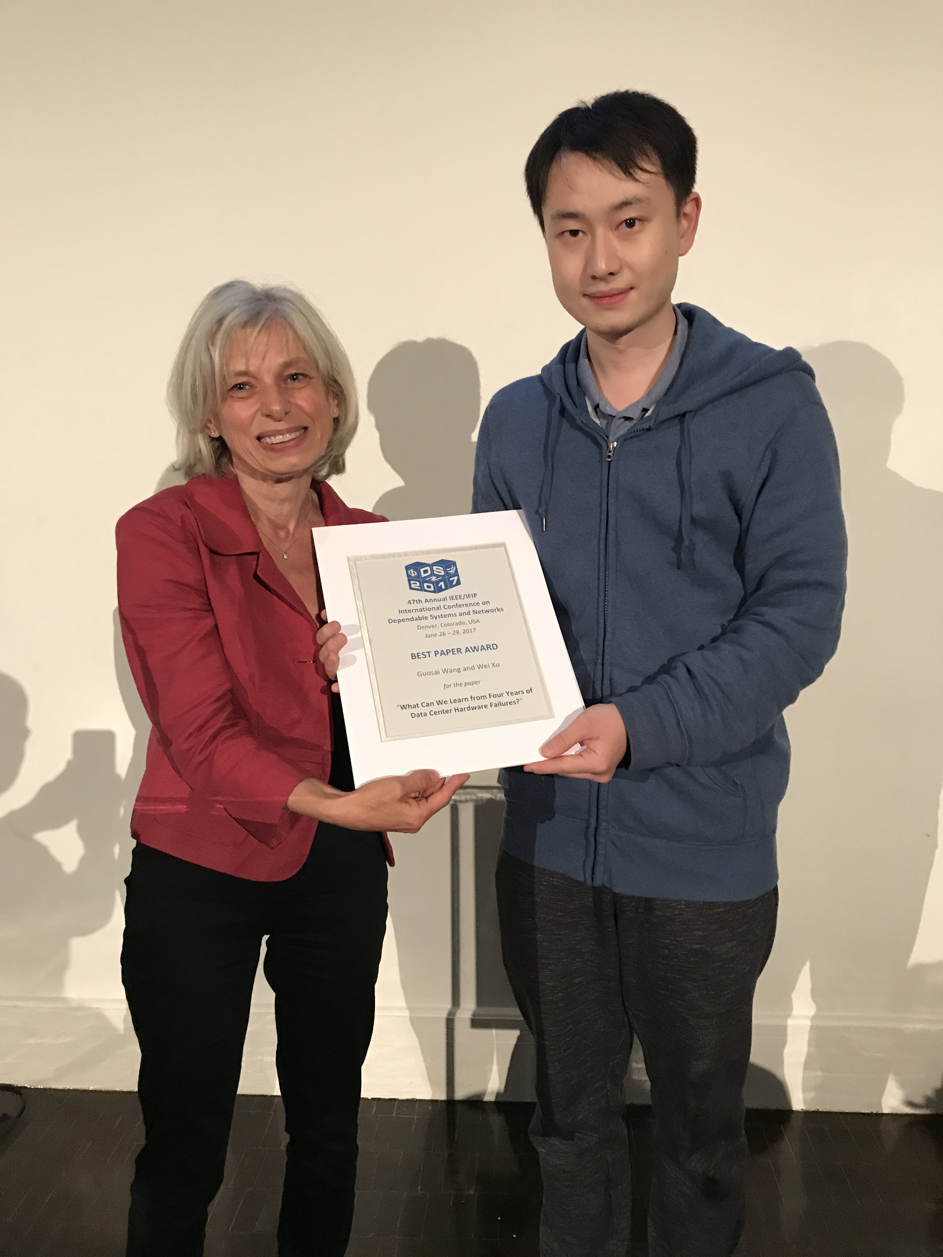 2017可靠系统和网络国际会议(DSN 2017)6月26至29日在美国丹佛市召开。PG电子游戏徐葳助理教授研究组的研究论文《分析四年的数据中心硬件故障日志,我们学到了什么?》(What Can We Learn from Four Years of Data Center Hardware Failures?)获得最佳论文奖,是国内单位历史上首次获得此项奖励。论文第一作者、PG电子游戏2014级博士研究生王国赛在大会全体会议上做了口头报告。