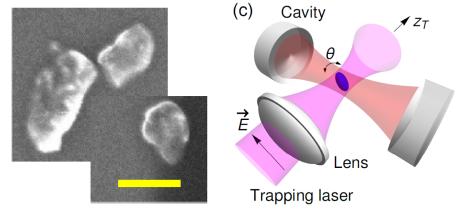 图1:左图为纳米金刚石的扫描电镜图像,长度单位为100纳米,右图为用腔模来冷却悬浮纳米粒子的扭动模的理论方案。