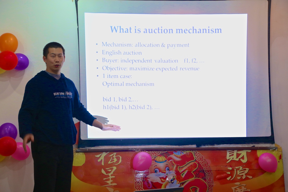 王子贺同学生动诙谐地讲解了计算机经济领域的拍卖问题。他首先解释了什么是拍卖问题,即设计一个经济机制,使得卖家的期望收入最大。随后重点讲解自己的研究工作,即在一个买家,2个不同物品的卖家的场景下,通过理论研究、公式推导、计算机模拟,如何使收入最大,并充分兼顾公平问题。