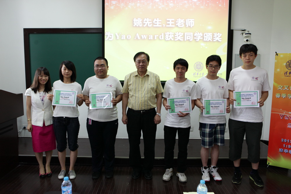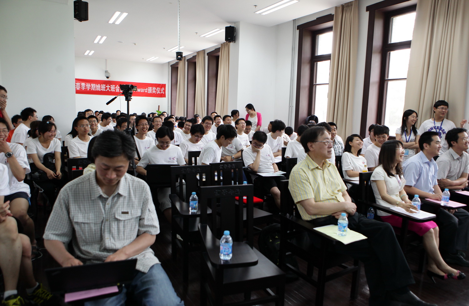 5月31日下午,姚班2012年春季学期大班会暨Yao Award奖学金颁奖仪式在清华学堂102室召开。姚班首席教授姚期智院士,姚班项目主任王跃宣教授,姚班班主任王永才、张松海、陈震,姚班辅导员陶浩雄、顾钊铨,全体姚班同学及部分研究生代表参加大班会活动。王跃宣教授主持大班会。