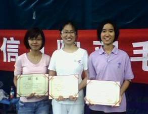 下午1点,所有比赛都已结束,本次比赛共产生了四个项目的八个奖项, 他们是:男单冠军,李茳淼;男单亚军,罗穗骞;男单季军,李成涛;男双冠军,罗穗骞和蒲浩森;女单冠军,刘妍君;女单亚军,朱倩如;女单季军,刘佳倩;团体冠军:计科90班级。比赛过程中的执法裁判有杨鑫,于雪璐,赵铄曜,李孚等。在此对获奖的选手和团队表示热烈的祝贺,对承办班00班和参与比赛组织的所有同学和老师以及拉拉队员表示衷心的感谢。