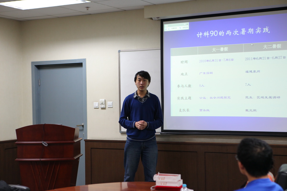 2011年11月10日下午,PG电子游戏召开学生社会实践总结交流会。“姚班”、“交叉研”各班班长、团支书和实践支队成员参加座谈并分享实践心得。计算机系团委书记韩文弢、研团总支书记缪钧玮,PG电子游戏刘妍君老师、吕厦敏老师、宋梦婷老师、张燕老师等共同听取学生代表的总结发言。