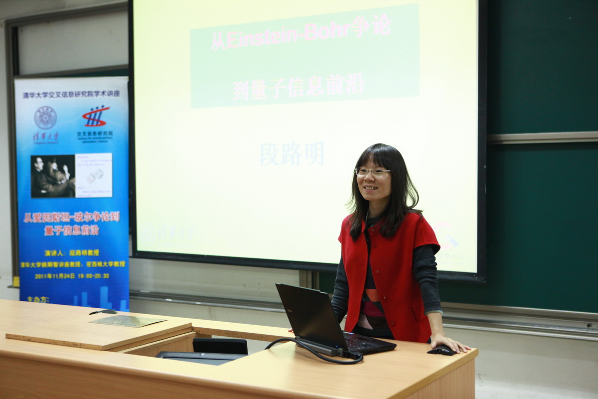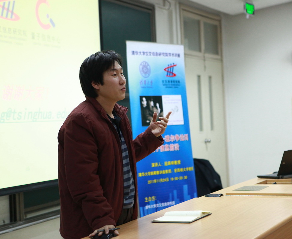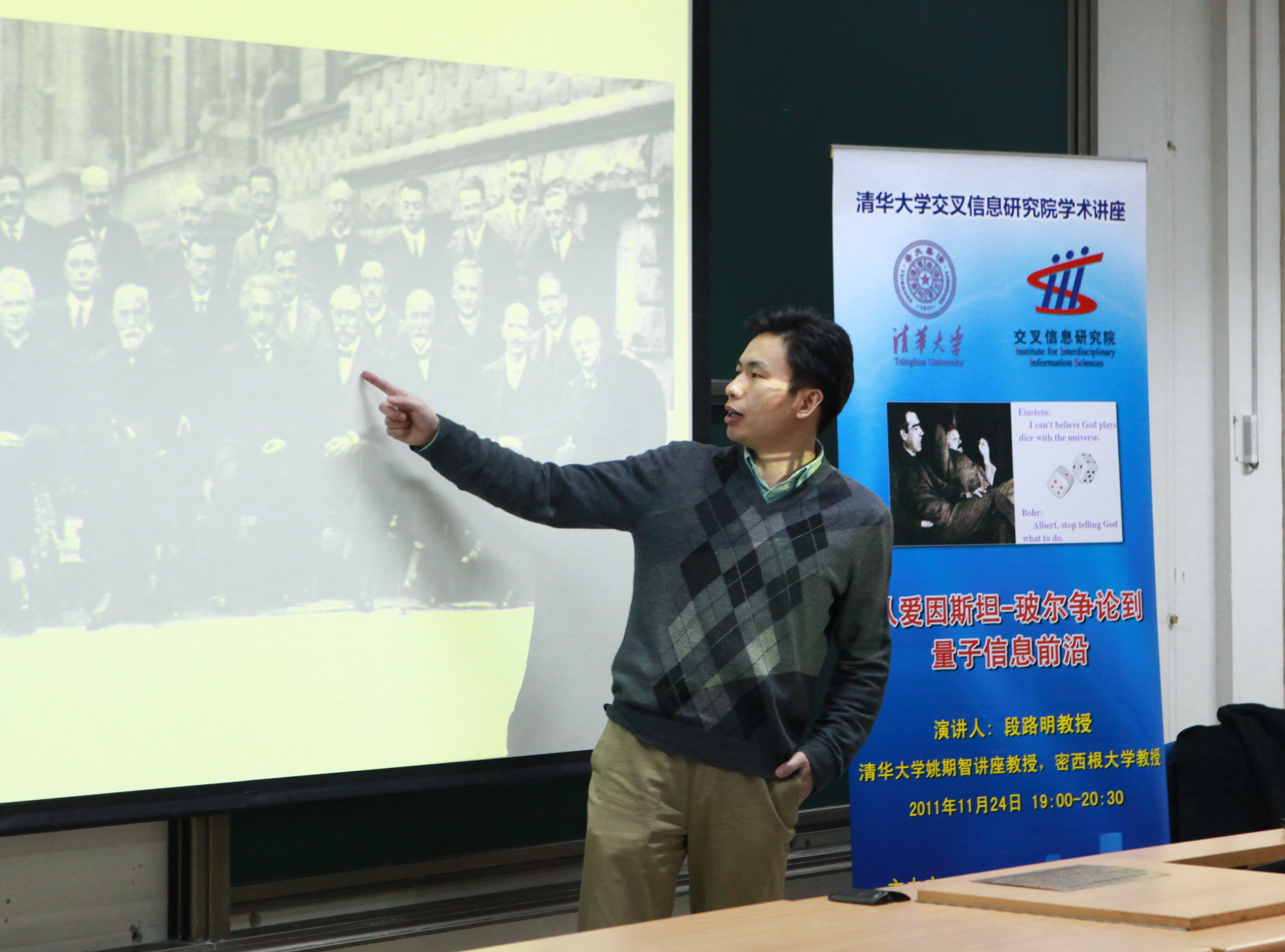 2011年11月24日晚,清华大学姚期智讲座教授、密西根大学教授段路明在北京大学物理学院中楼212教室作了一场主题演讲:《从爱因斯坦、玻尔争论到量子信息前沿》。清华大学PG电子游戏副院长王跃宣教授主持讲座并做招生宣讲,来自北大、清华的学生共同聆听演讲。