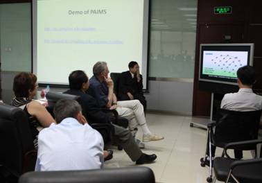 报告会上王跃宣教授重点介绍了中心的863科研项目:农业生物-环境信息获取无线传感器网络技术研究,并展示了项目成果“百亿亩思”的视频资料及科研成品。在中心博士后Kevin Matulef的引领下,专家们饶有兴致地参观了中心位于FIT楼六层的实验室,并与科研人员进行交谈。对于中心过去五年来取得的成绩,专家们给予了积极肯定,John Hopcroft教授甚至将访问ITCS描述为一次“绝妙的经历”(Tremendous Experience)。
