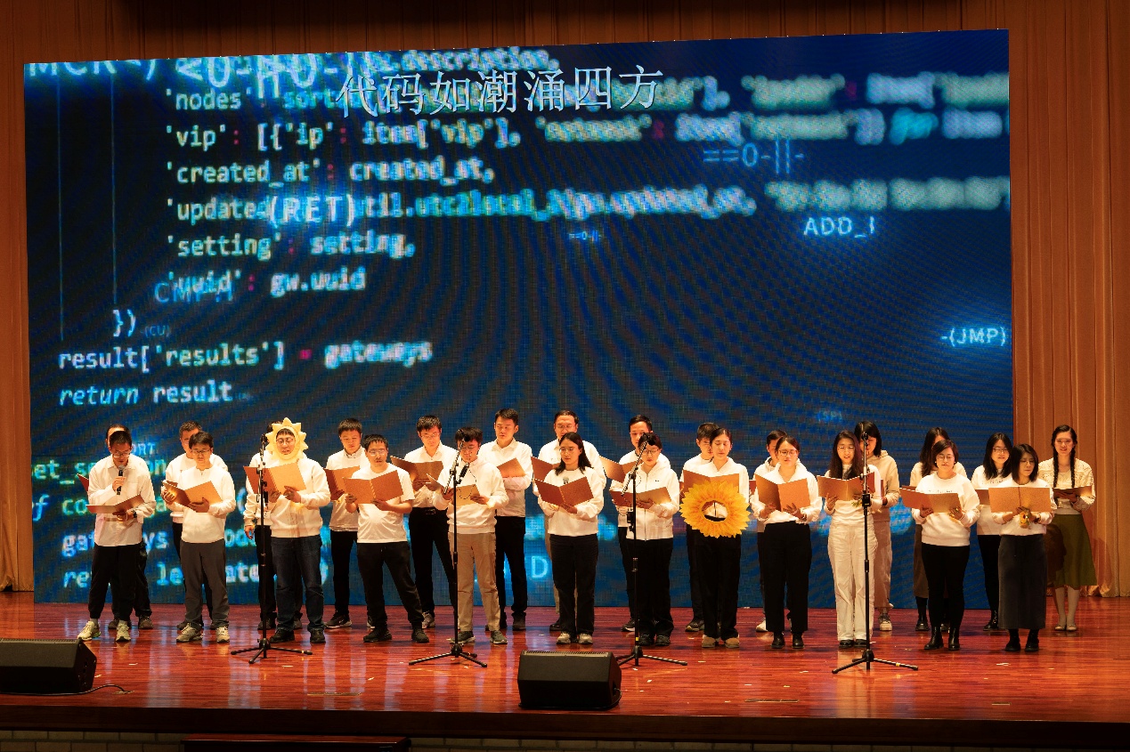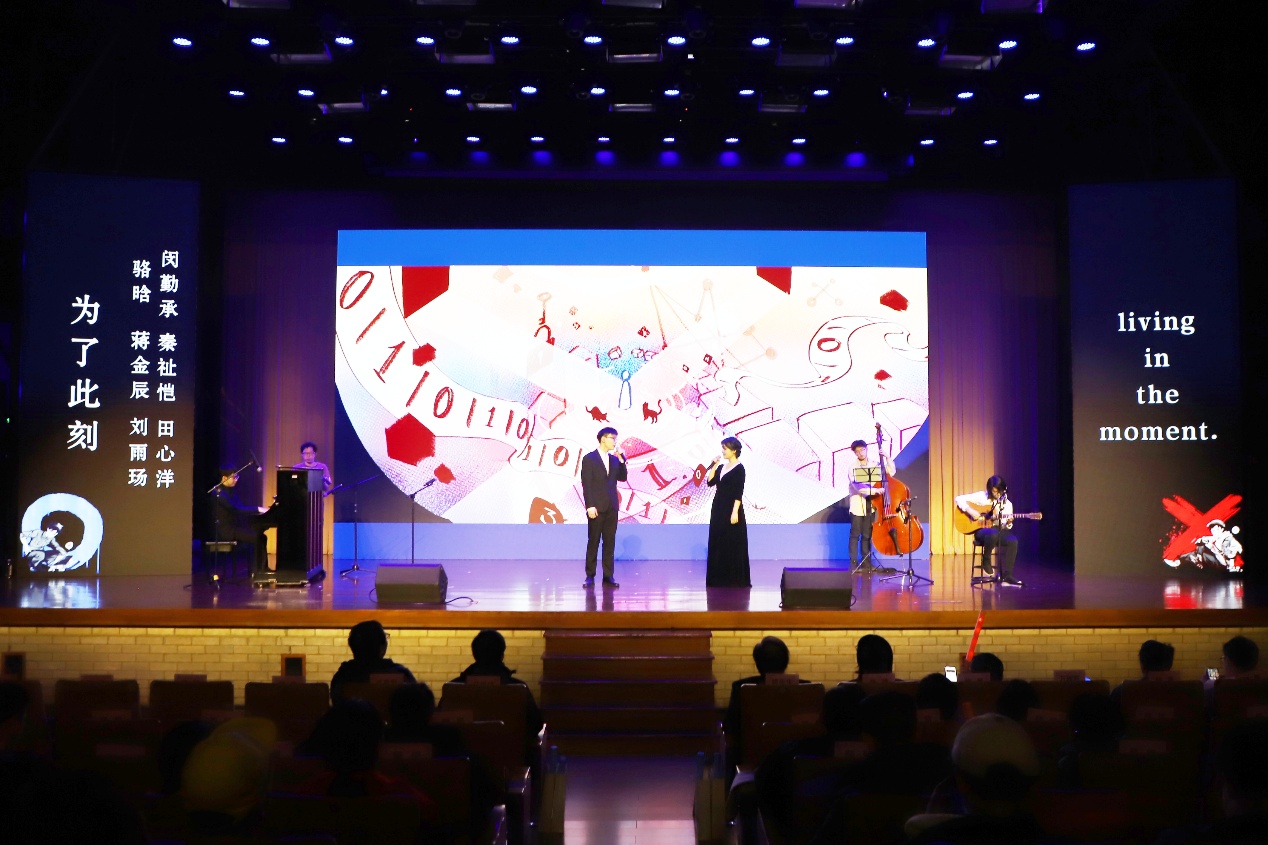 节目伊始,2023级博士生骆晗、计科23班蒋金辰、2022级博士生刘雨玚、计科33班秦祉恺、计科22班田心洋五名主创登台带来现场版主题曲《为了此刻》。歌声传递出“探索是为了此刻,活的足够真切”的深刻内涵。